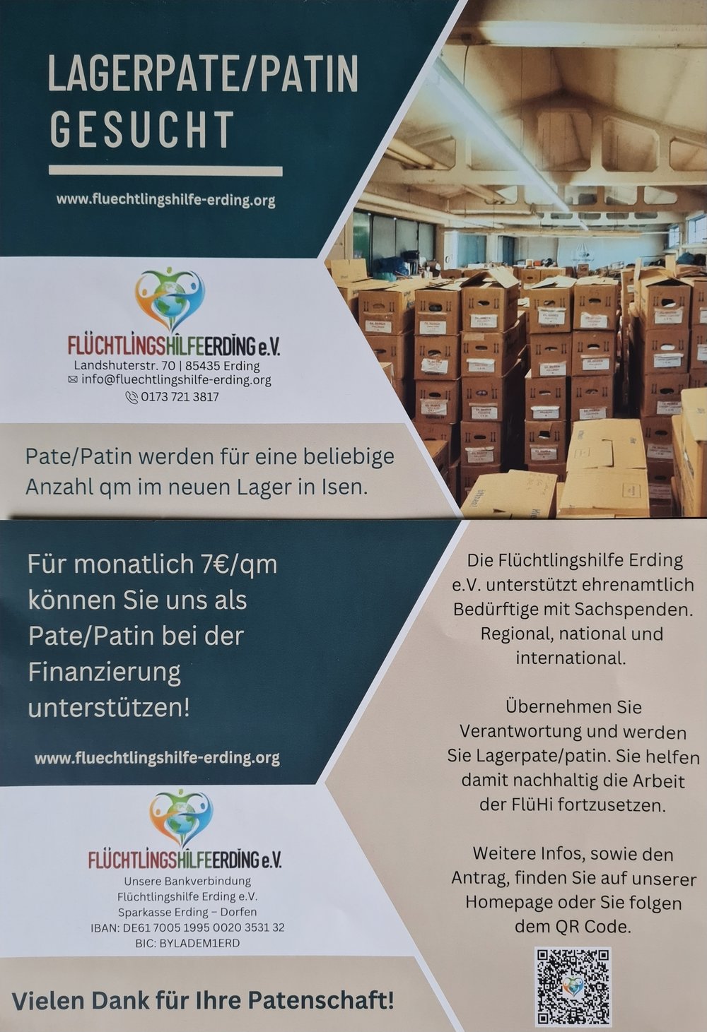 Im Zuge des Umzugs versucht die Flüchtlingshilfe Erding nun für das Lager in Isen einen neuen Kreis an Helfenden aufzubauen und sucht daher erneut im gesamten Landkreis Erding nach helfenden Händen. Durch höhere Mietkosten für die Räumlichkeiten in Isen sucht die Flüchtlingshilfe außerdem nach Paten und Patinnen, die einen Teil der Kosten für den Umzug und das Lager in Isen mittragen. Denn anders als im Fliegerhorst in Erding, muss die FlüHi in den angemieteten Hallen in Isen jetzt Miete zahlen. Dafür benötigt der Verein auch vermehrt finanzielle Unterstützung.