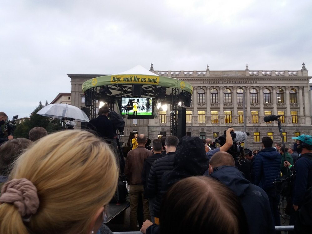 Ich war letzte Woche gerade zufällig in Leipzig, um dort einen Teil meiner Familie zu besuchen und stieß beim gemeinsamen Schlendern durch die bunt-plakatierte Altstadt natürlich auch auf GRÜNEN-Plakate. Anders als bei den Plakaten hier auf dem Dorf war unter den meisten grünen Plakate noch ein zusätzlicher Aufkleber angebracht, der darauf hinwies, dass am Freitag, den 17.09. um fünf Uhr sowohl Annalena Baerbock, als auch Robert Habeck auf dem zentralen Leipziger Wilhelm-Leuschner-Platz (bekannt vor allem für seine Rolle in der Friedlichen Revolution) an einer großen Wahlkampfveranstaltung teilnehmen würden. Wie spannend! Für mich – aufgewachsen auf dem Land – war das eine seltene Chance, unkompliziert bei einer solchen, großen politischen Veranstaltung dabei zu sein und somit sogar beiden Parteivorsitzenden auf einmal zu begegnen, denn meistens sind die beiden im Wahlkampf getrennt unterwegs. Das konnte ich mir also nicht entgehen lassen.